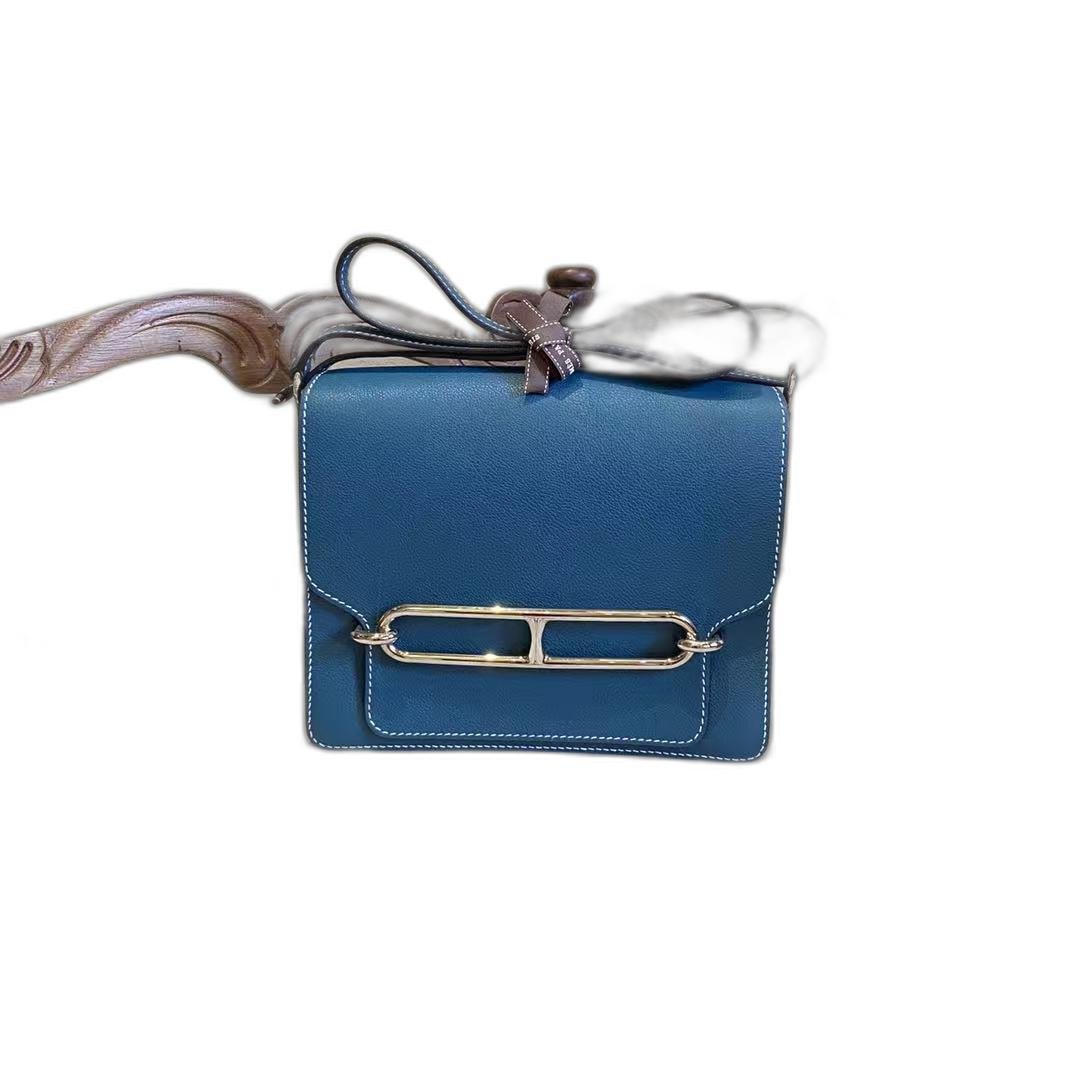 + Free ShippingThe Hermès Verrou is a small, structured bag with a distinctive and ingenious lock-shaped clasp. The name “Verrou” means “lock” or “bolt” in French, referring to the unique, functional closure. The bag’s clean lines and elegant design make it a chic and modern accessory, often worn as a clutch or a shoulder bag with a thin leather strap. This particular bag, in a vibrant blue with contrasting white stitching and silver-toned hardware, exemplifies Hermès’s commitment to meticulous craftsmanship and sophisticated design.